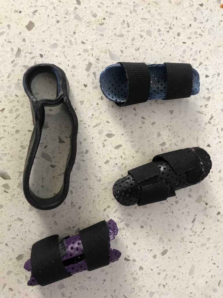 Louise used her splints, some during the day, some during the night. These protected her finger through driving, writing and everyday tasks in her life. The splints came off when Louise did her finger exercises.
