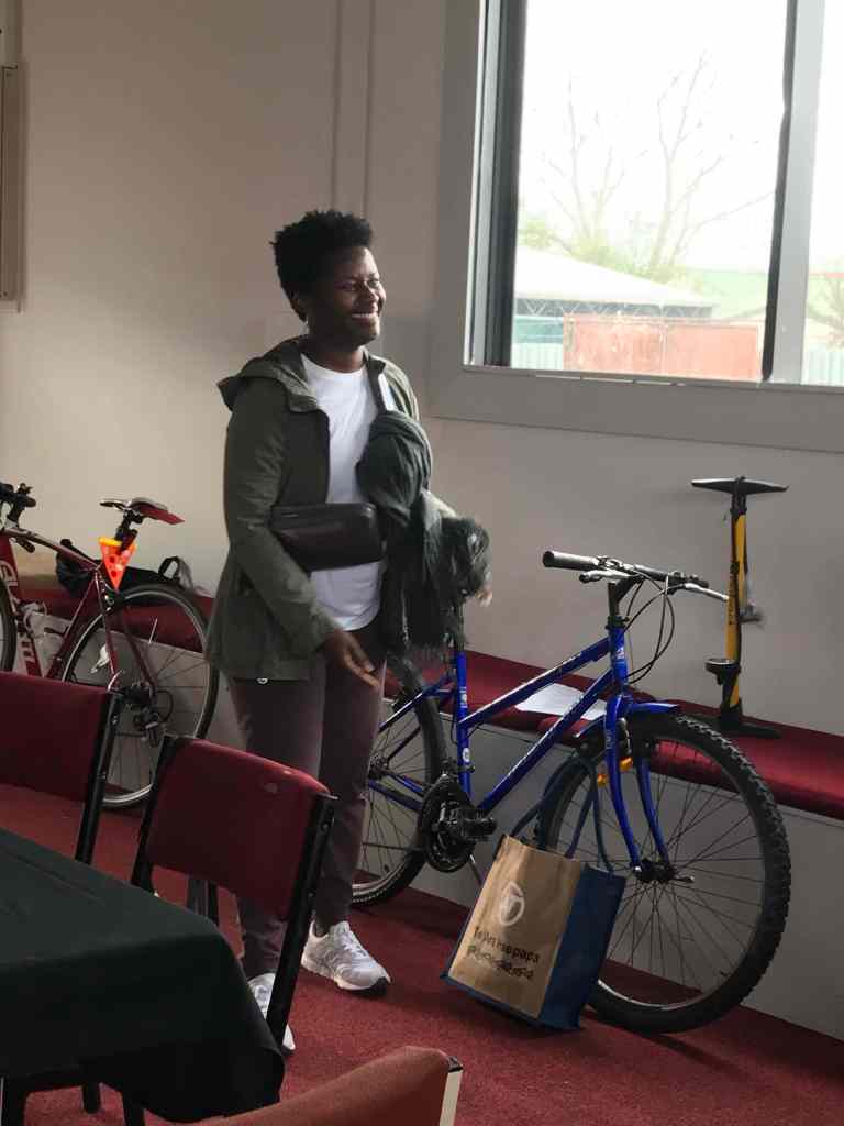 Here is a photo of the lovely Maya, who won our free bike and helmet, donated by Louise Tu’u, and lock, lights and cool merch from Te Ara Haepapa.