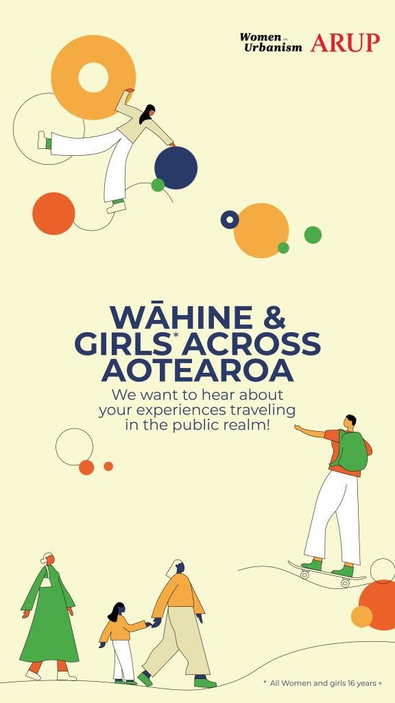 Also, Women in Urbanism Aotearoa and Arup would like to know more and raise awareness of issues identified by women and girls in the urban space by asking them to fill out a survey: https://www.womeninurbanism.co.nz/urban-experiences.